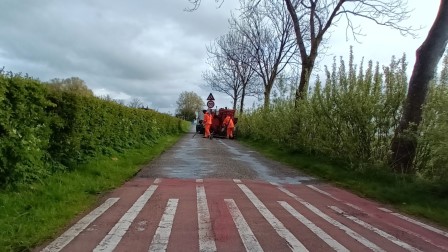 Vijf mannen in oranje, met gehoorbescherming en twee wagens van Broek kwamen in een parade met blauwe wolk omhult en in een geur van gesmolten asfalt voorbij schrijden.